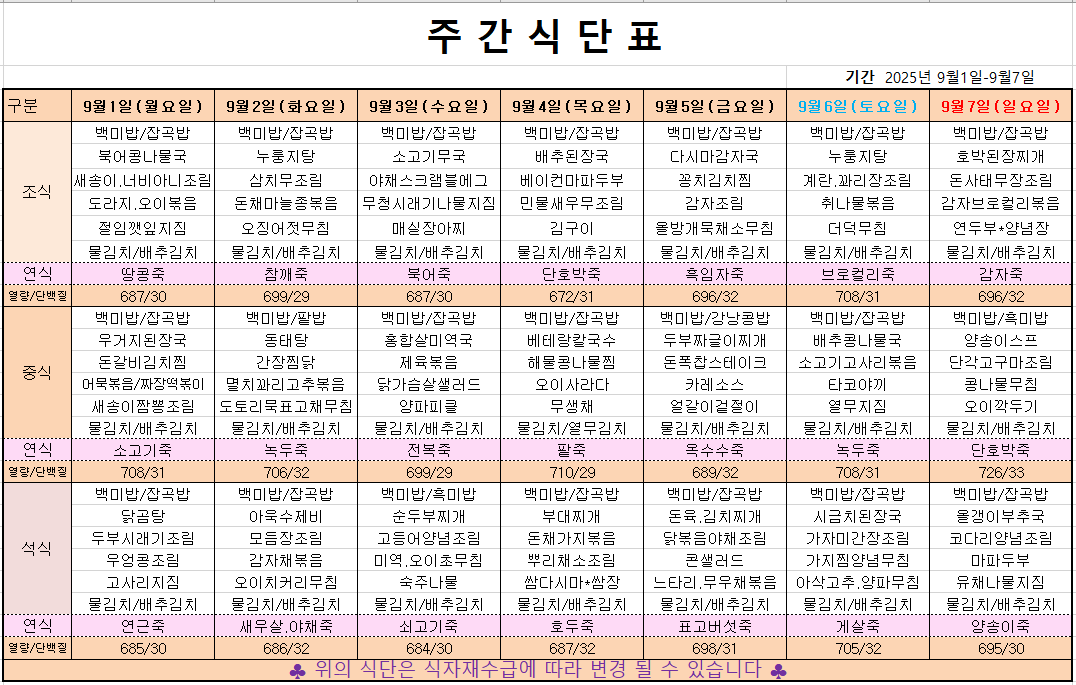 9월 1째주 주간메뉴표입니다 페이지 정보 작성자 관리자 댓글 0건 조회 303회 작성일 25-08-30 09:25 본문 목록 이전글9월 2째주 주간메뉴표입니다 25.09.06 다음글8월 4째주 주간메뉴표입니다 25.08.23