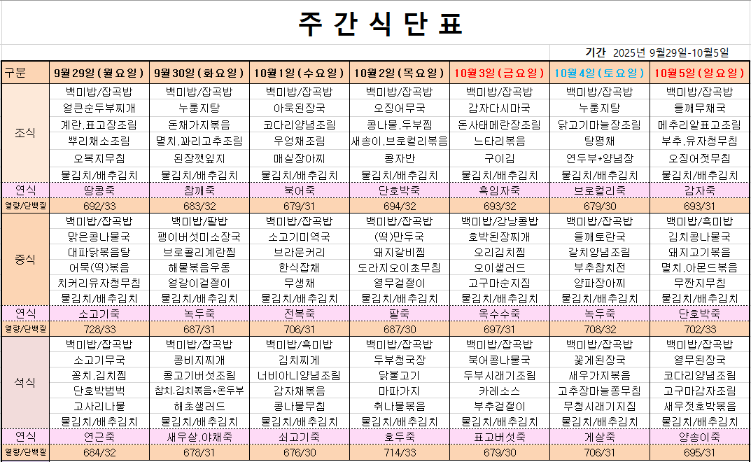 10월 1째주 주간메뉴표입니다 페이지 정보 작성자 관리자 댓글 0건 조회 208회 작성일 25-09-29 14:12 본문 목록 이전글10월2째주 주간메뉴표입니다 25.10.02 다음글9월 4째주 주간메뉴표입니다 25.09.19