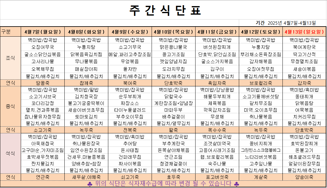 4월 2째주 주간메뉴표입니다 페이지 정보 작성자 관리자 댓글 0건 조회 395회 작성일 25-04-04 06:46 본문 목록 이전글4월 3째주 주간메뉴표입니다 25.04.11 다음글4월 1째주 주간메뉴표입니다 25.03.28