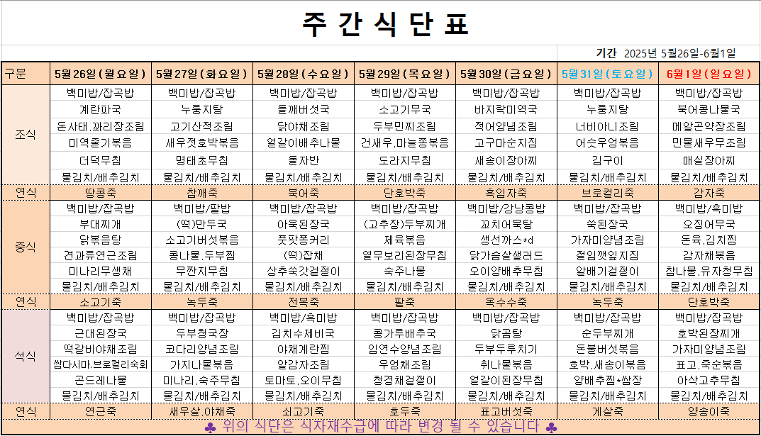 5월5째주 주간메뉴표입니다 페이지 정보 작성자 관리자 댓글 0건 조회 478회 작성일 25-05-23 09:42 본문 목록 이전글6월 1째주 주간메뉴표입니다 25.05.30 다음글5월 4째주 주간메뉴표입니다 25.05.17