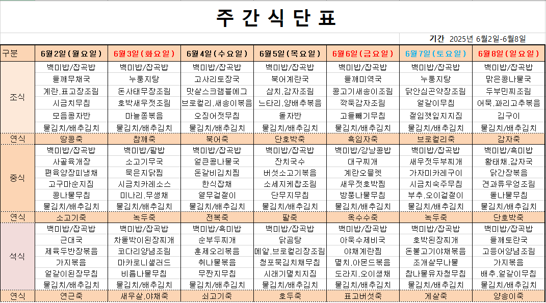 6월 1째주 주간메뉴표입니다 페이지 정보 작성자 관리자 댓글 0건 조회 361회 작성일 25-05-30 14:57 본문 목록 이전글6월 2째주 주간메뉴표입니다 25.06.07 다음글5월5째주 주간메뉴표입니다 25.05.23