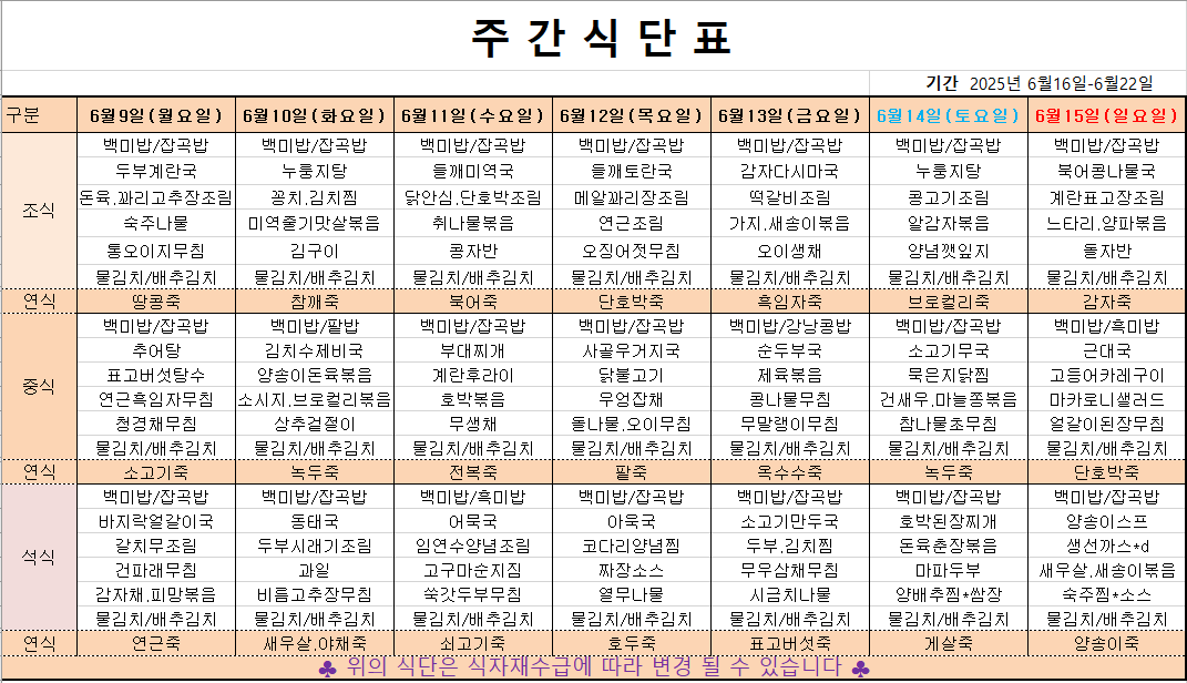 6월 2째주 주간메뉴표입니다 페이지 정보 작성자 관리자 댓글 0건 조회 367회 작성일 25-06-07 09:12 본문 목록 이전글6월 3째주 주간메뉴표입니다 25.06.14 다음글6월 1째주 주간메뉴표입니다 25.05.30