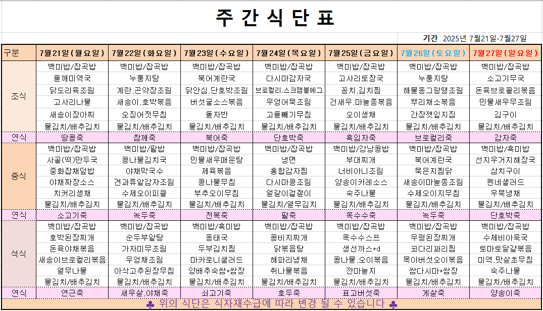 7월 4째주 주간메뉴표입니다 페이지 정보 작성자 관리자 댓글 0건 조회 358회 작성일 25-07-19 09:33 본문 목록 이전글7월 5째주 주간메뉴표입니다 25.07.26 다음글7월 3째주 주간메뉴표입니다 25.07.12