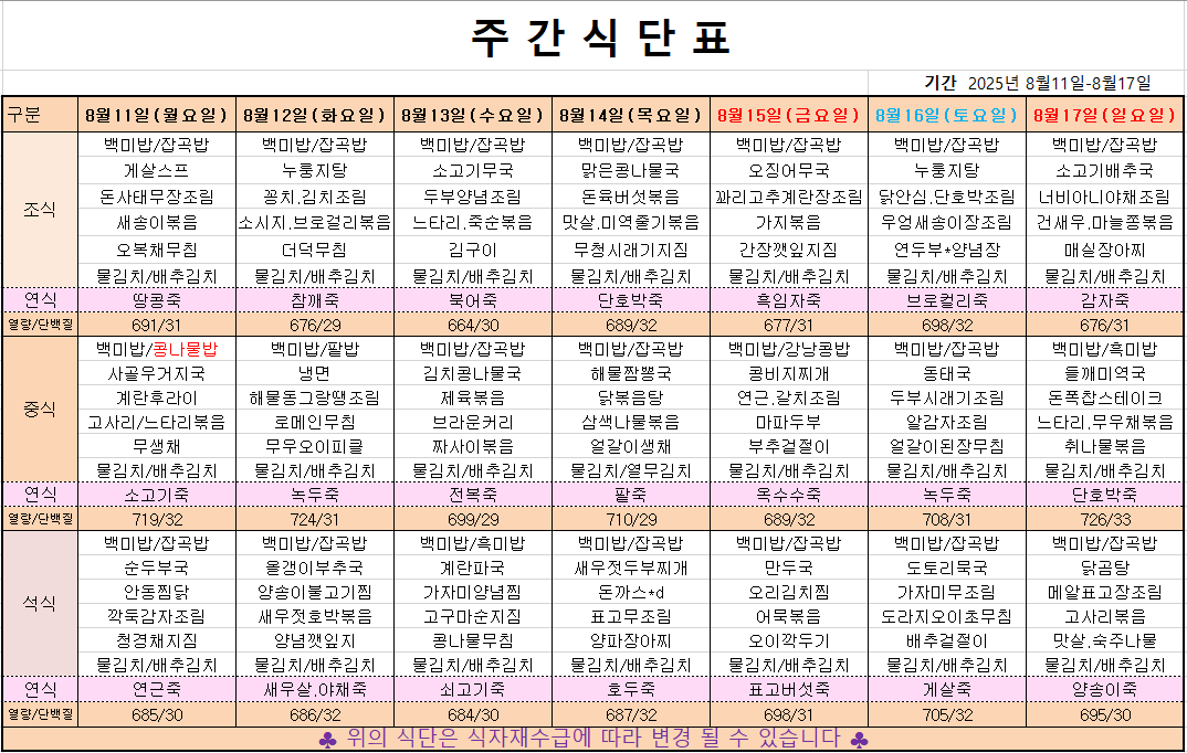 8월 2째주 주간메뉴표입니다 페이지 정보 작성자 관리자 댓글 0건 조회 297회 작성일 25-08-09 12:06 본문 목록 이전글8월 3째주 주간메뉴표입니다 25.08.16 다음글8월 1째주 주간메뉴표입니다 25.08.02