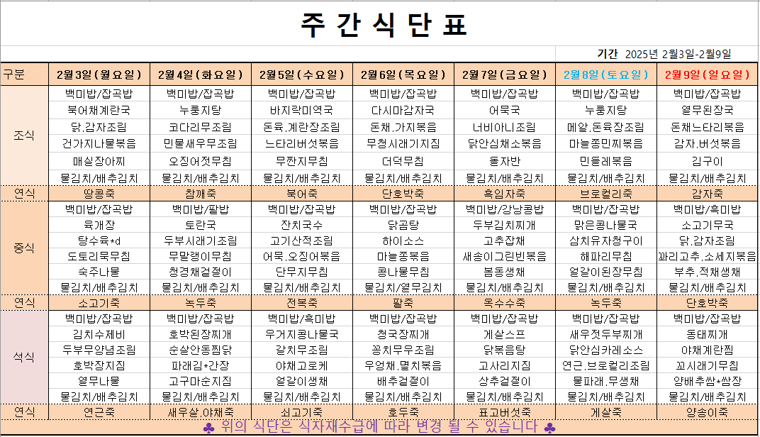 2월 1째주 주간메뉴표입니다 페이지 정보 작성자 관리자 댓글 0건 조회 383회 작성일 25-02-01 09:48 본문 목록 이전글2월 2째주 주간메뉴표입니다 25.02.07 다음글1월 5째주 주간메뉴표입니다 25.01.24
