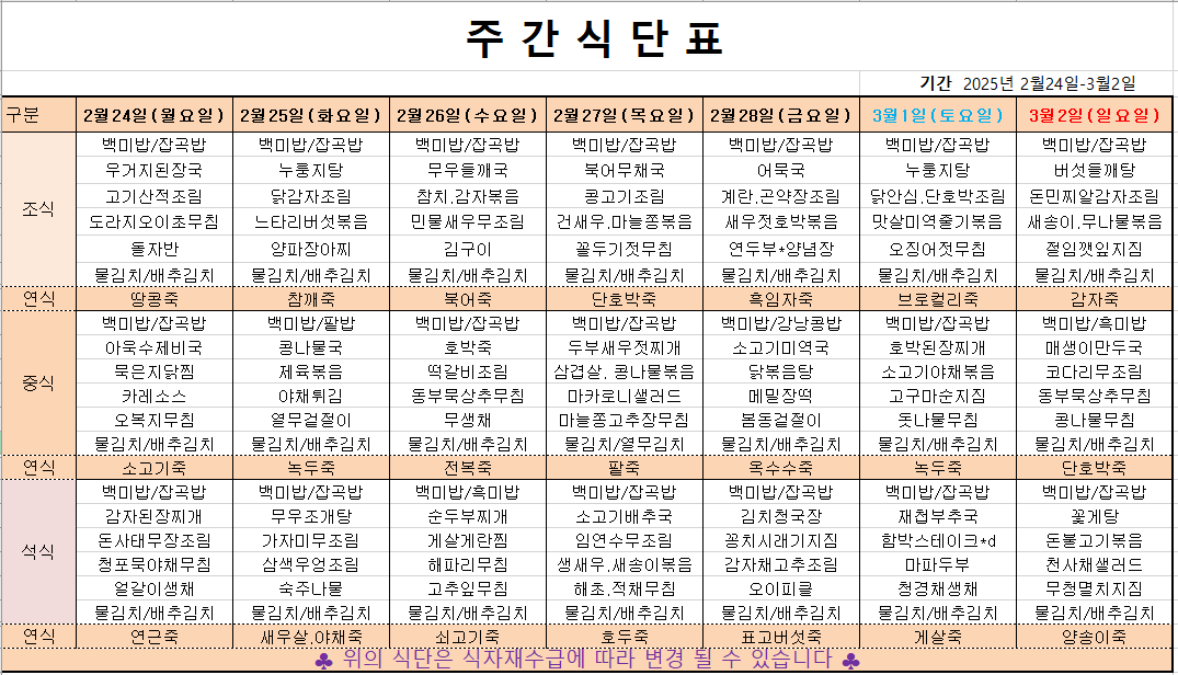 2월 4째주 주간메뉴표입니다 페이지 정보 작성자 관리자 댓글 0건 조회 385회 작성일 25-02-21 13:59 본문 목록 이전글3월 1째주 주간메뉴표입니다 25.02.28 다음글2월 3째주 주간메뉴표입니다 25.02.13