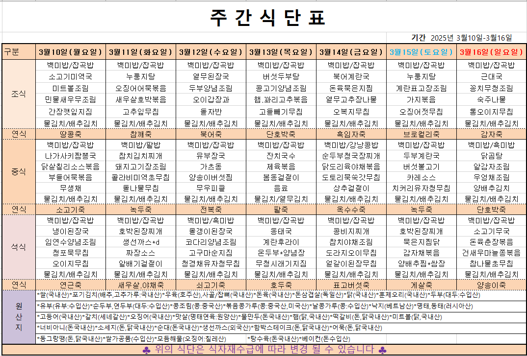 3월 2째주 주간메뉴표입니다 페이지 정보 작성자 관리자 댓글 0건 조회 412회 작성일 25-03-07 12:17 본문 목록 이전글3월 3째주 주간메뉴표입니다 25.03.14 다음글3월 1째주 주간메뉴표입니다 25.02.28