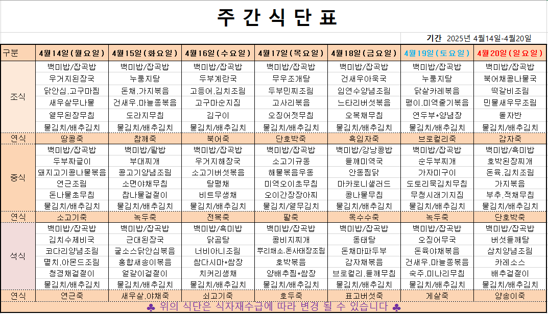 4월 3째주 주간메뉴표입니다 페이지 정보 작성자 관리자 댓글 0건 조회 374회 작성일 25-04-11 16:59 본문 목록 이전글4월 4째주 주간메뉴표입니다 25.04.17 다음글4월 2째주 주간메뉴표입니다 25.04.04
