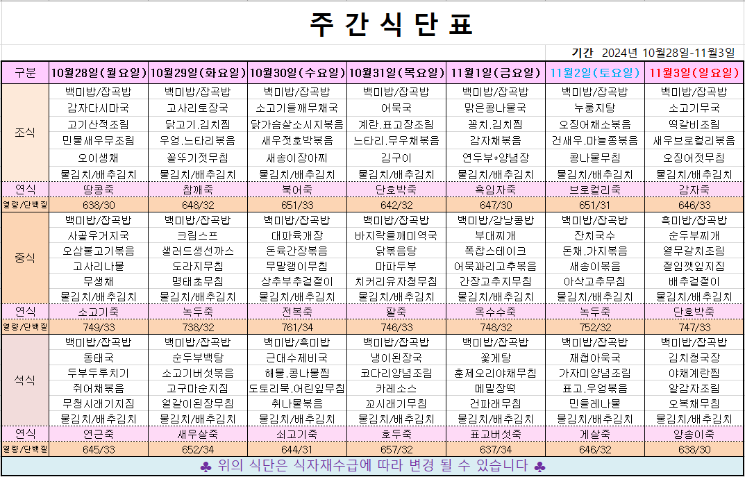 10월 5째주 주간메뉴표입니다 페이지 정보 작성자 관리자 댓글 0건 조회 482회 작성일 24-10-25 11:15 본문 목록 이전글11월 1째주 주간메뉴표입니다 24.10.30 다음글10월 4째주 주간메뉴표입니다 24.10.17