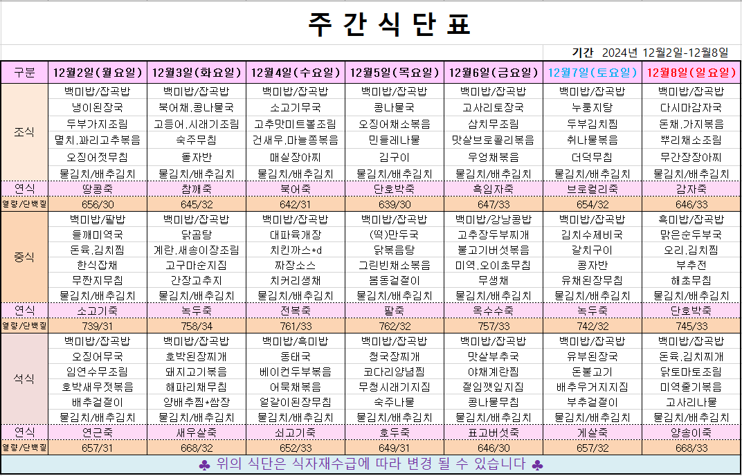 12월 1째주 주간메뉴표입니다 페이지 정보 작성자 관리자 댓글 0건 조회 492회 작성일 24-11-30 09:54 본문 목록 이전글12월 2째주 주간메뉴표입니다 24.12.10 다음글11월 4째주 주간메뉴표입니다 24.11.21