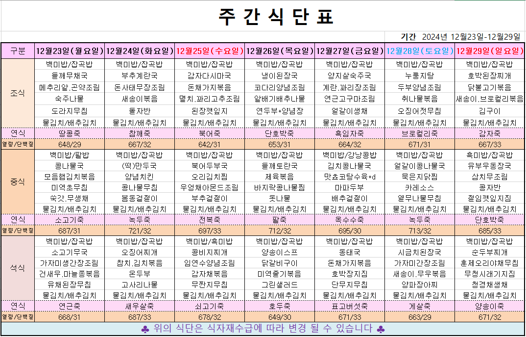 12월 4째주 주간메뉴표입니다 페이지 정보 작성자 관리자 댓글 0건 조회 399회 작성일 24-12-20 10:51 본문 목록 이전글1월 1째주 주간메뉴표입니다 24.12.27 다음글12월 3째주 주간메뉴표입니다 24.12.13