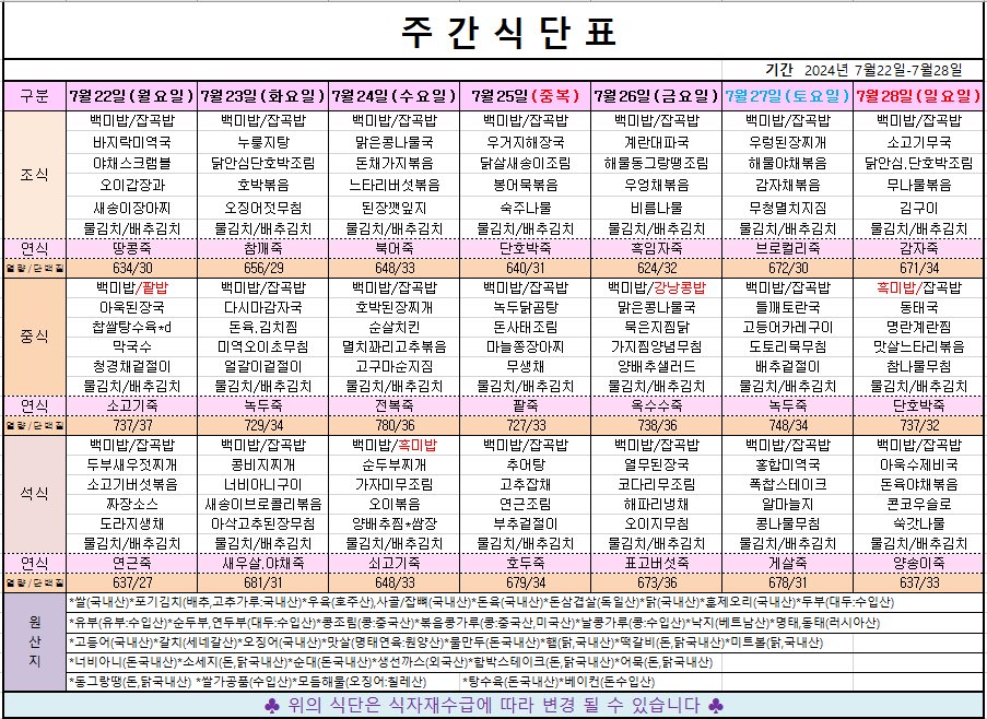 7월 4째주 주간메뉴표입니다 페이지 정보 작성자 관리자 댓글 0건 조회 571회 작성일 24-07-19 09:33 본문 목록 이전글7월 5째주 주간메뉴표입니다 24.08.01 다음글7월 3째주 주간메뉴표입니다 24.07.12