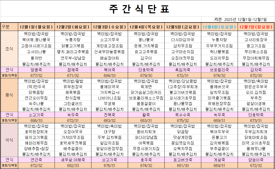 12월 1째주 주간메뉴표입니다 페이지 정보 작성자 관리자 댓글 0건 조회 220회 작성일 25-11-29 09:18 본문 목록 이전글12월 2째주 주간메뉴표입니다 25.12.05 다음글11월 4째주 주간메뉴표입니다 25.11.24