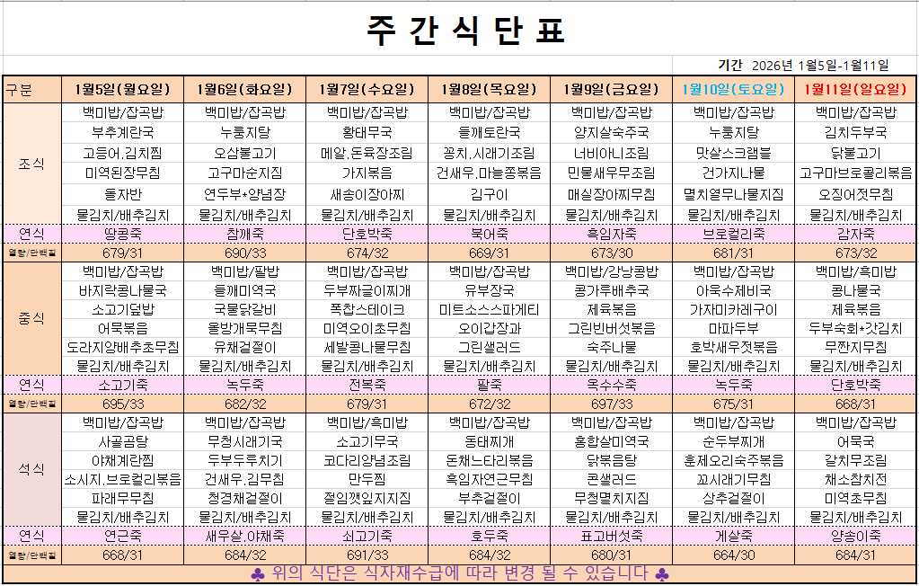 1월 1째주 주간메뉴표입니다 페이지 정보 작성자 관리자 댓글 0건 조회 244회 작성일 26-01-02 10:27 본문 목록 이전글1월 2째주 주간메뉴표입니다 26.01.10 다음글12월 5째주 주간메뉴표입니다 25.12.27