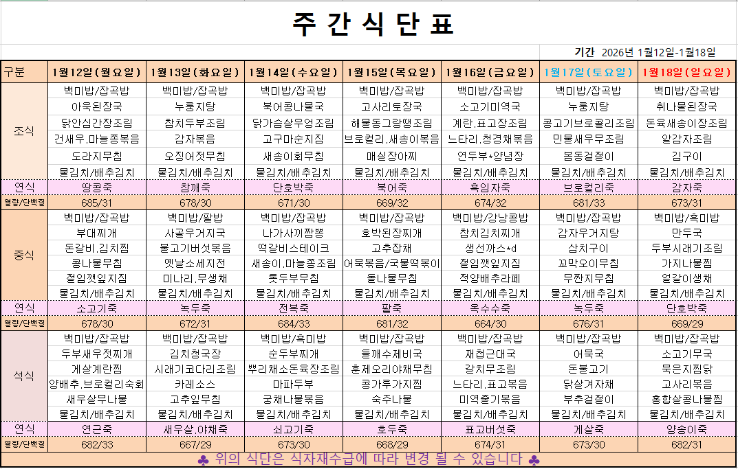 1월 2째주 주간메뉴표입니다 페이지 정보 작성자 관리자 댓글 0건 조회 236회 작성일 26-01-10 10:02 본문 목록 이전글1월 3째주 주간메뉴표입니다 26.01.16 다음글1월 1째주 주간메뉴표입니다 26.01.02