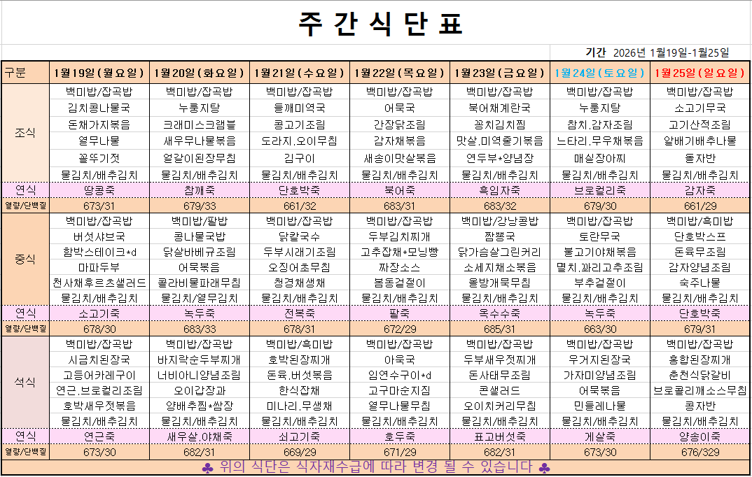 1월 3째주 주간메뉴표입니다 페이지 정보 작성자 관리자 댓글 0건 조회 220회 작성일 26-01-16 10:46 본문 목록 이전글1월 4째주 주간메뉴표입니다 26.01.24 다음글1월 2째주 주간메뉴표입니다 26.01.10