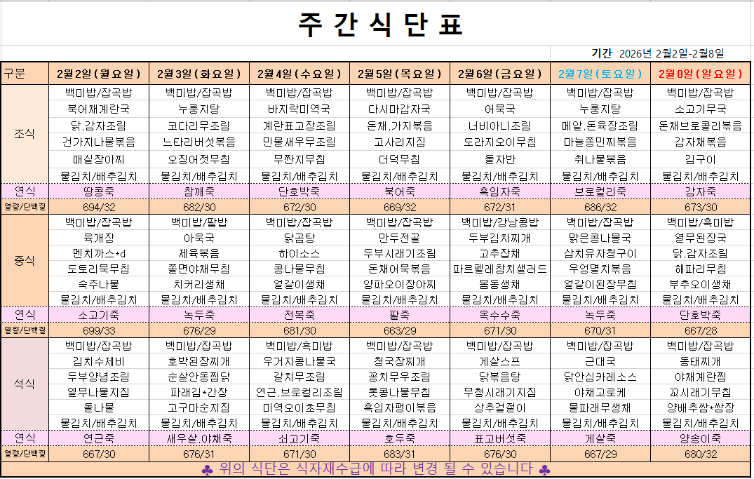 2월 1째주 주간메뉴표입니다 페이지 정보 작성자 관리자 댓글 0건 조회 237회 작성일 26-01-29 13:32 본문 목록 이전글2월 2째주 주간메뉴표입니다 26.02.09 다음글1월 4째주 주간메뉴표입니다 26.01.24