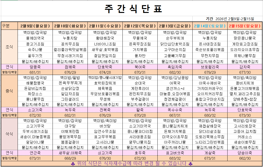2월 2째주 주간메뉴표입니다 페이지 정보 작성자 관리자 댓글 0건 조회 173회 작성일 26-02-09 07:17 본문 목록 이전글2월 3째주 주간메뉴표입니다 26.02.13 다음글2월 1째주 주간메뉴표입니다 26.01.29